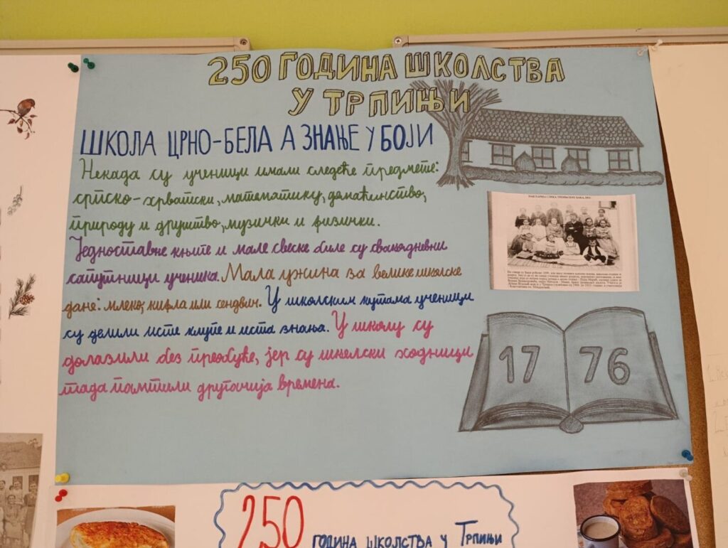 Ученици 3. разреда су у четвртак, 12. фебруара, организовали презентацију својих истраживачких радова у оквиру истраживачког задатка „250 година школства у Трпињи“. Циљ задатка био је да ученици истраже како је некада изгледала школа у нашем месту. Ученици су разговарали са бакама, декама и другим старијим особама које су похађале школу у Трпињи. Током разговора прикупљали су податке о томе које су предмете ученици некада учили, какве су књиге и свеске имали, шта су носили за ужину, како су се облачили за школу, да ли су постојале школске униформе и да ли се у школи носила преобућа. На основу прикупљених информација ученици су израдили плакате и припремили кратка усмена излагања. Многи су донели старе фотографије, сведочанства, књиге, као и табле за писање и рачунање, чиме су своје презентације учинили посебно занимљивим и аутентичним. У оквиру домаћинства ученици су додатно истраживали шта се некада јело за ужину. На основу тог истраживања заједнички смо припремили и пробали традиционалне ужине: хлеб с машћу, лангошице , завијаче, хлеб с пекмезом и чај. Презентација је протекла у пријатној и радној атмосфери. Ученици су показали велико интересовање, сарадњу и креативност, а кроз овај задатак научили су много о школовању и животу деце у прошлости нашег места.